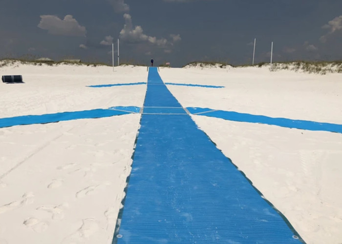 O tapete de acesso à praia é concebido para ser um caminho de deslizamento antiderrapante, resistente ao calor e estável, perfeito para cadeiras de rodas e outros dispositivos de assistência à mobilidade.